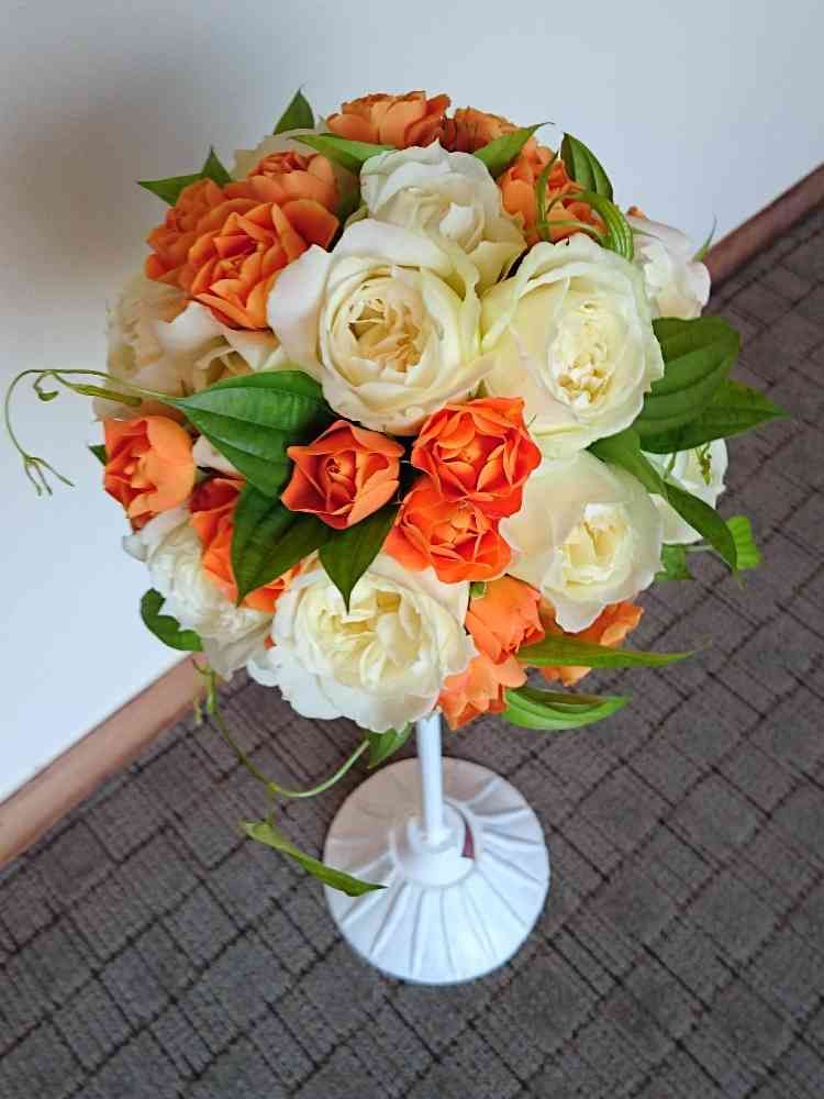 こんにちは。コロンと丸くなってるブーケの事をコロニアルブーケと言って、スタンダードなタイプですね♪私は友人達には特別にキャスケードブーケを作ってあげます✨コロニアルの下を花が流れるように揺れてゴージャスで好きなんですけどね♪どんな形か検索してみてね😉