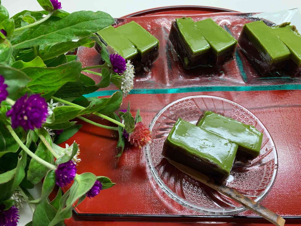 粉末抹茶ラテを1カップ(くらいだったかな)の水で溶かしアガーで同じように煮て水ようかんの上に流して固めます。
