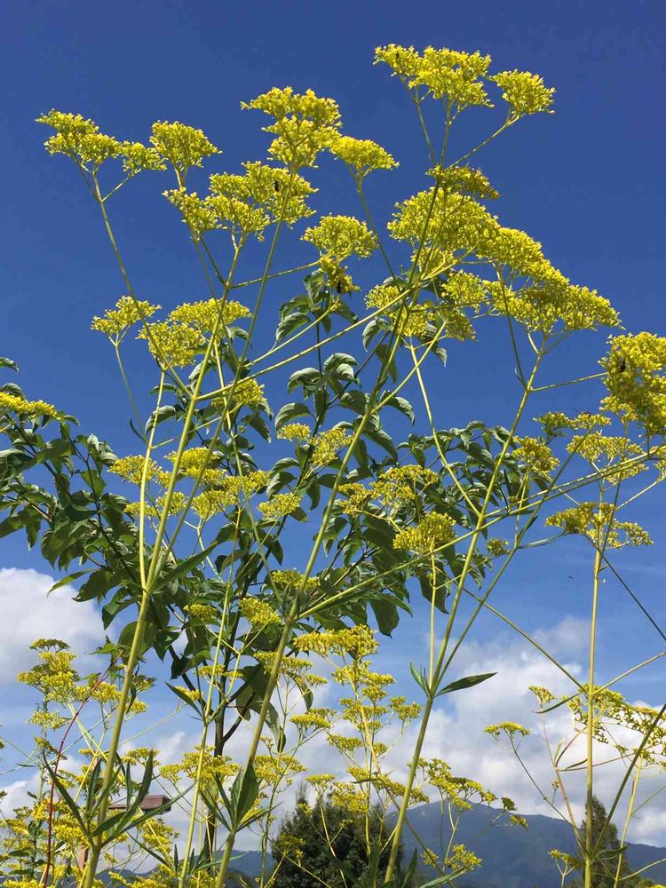 青い空と、背景の山々、そして凛として咲き誇るオミナエシの花