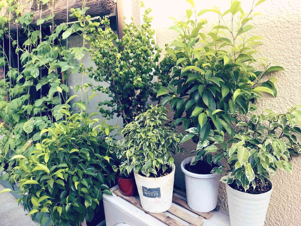 ベンジャミン軍団の成長。実がなったり挿し木苗も倍以上に伸びたりと成長目覚ましい。この夏は結構日光に当てたが葉焼けはなかった。やっぱりお日様に恋をしてるんだな。