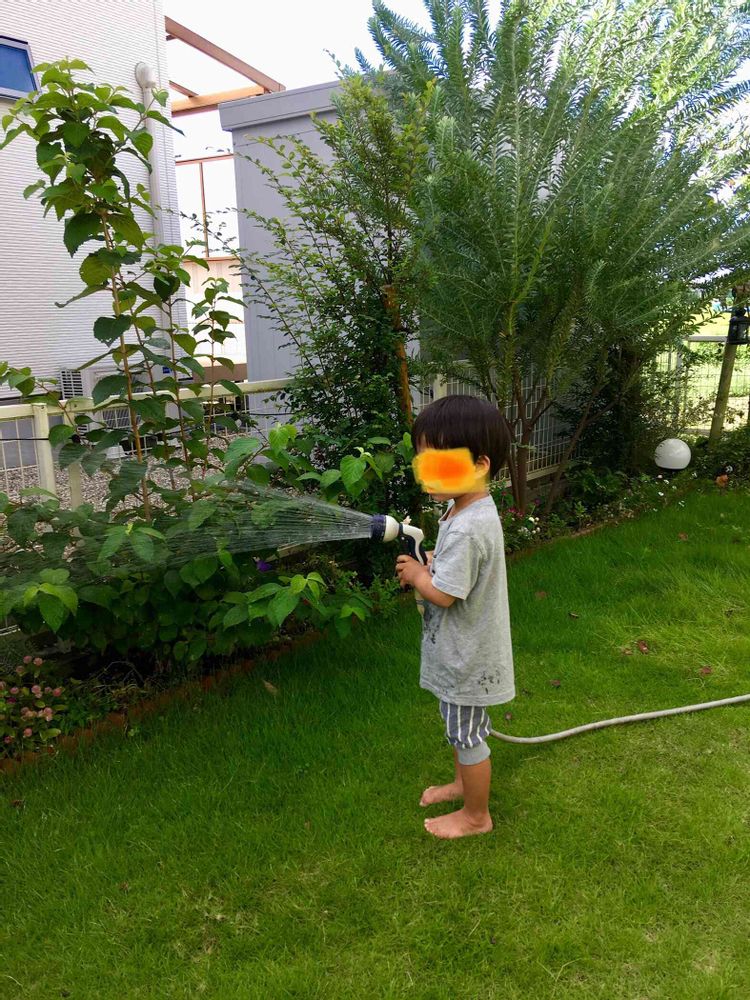 今日も日差しは暑いですね。風邪ひき息子。熱があるのに元気です。真顔で ひたすら放水。まんべんなく水遣りしてくれればいいんですがいつも一ヶ所集中。葉っぱ狙いです😅