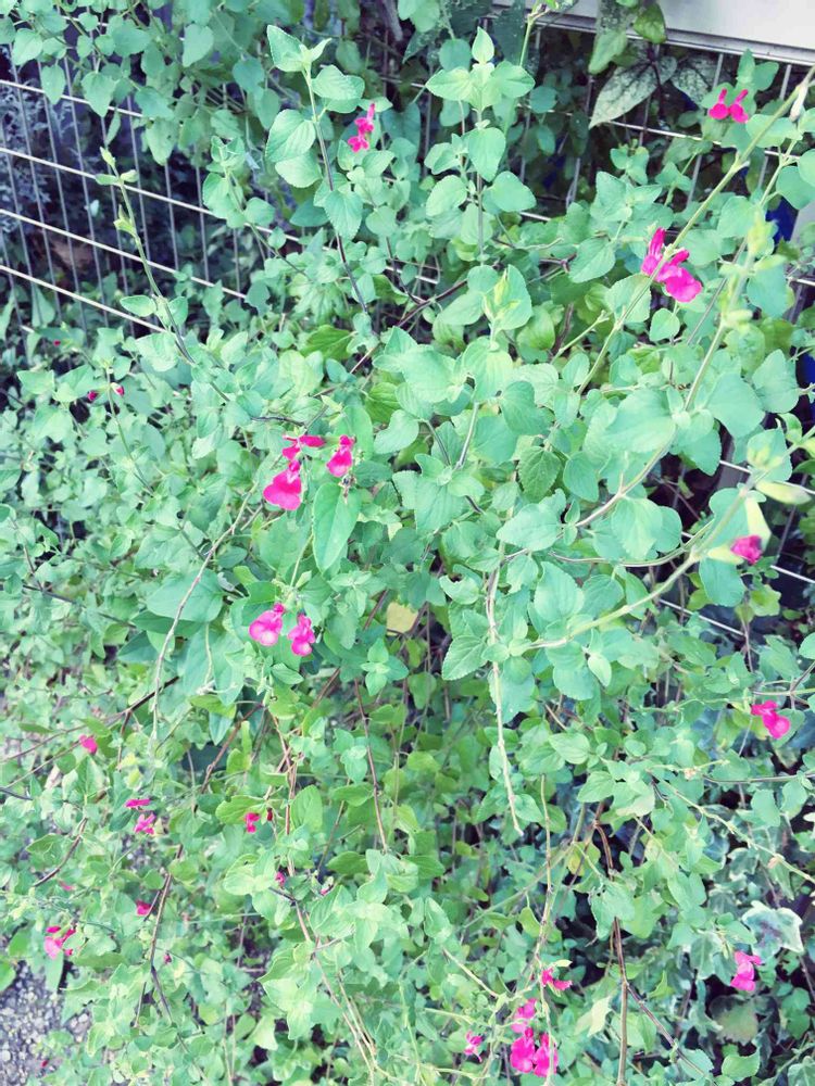 2019/9/7 チェリーセージ ホットリップス💋 名前と花の形がとても気に入っている、、割には伸び放題の放置状態で、一年ほど前にようやくバッサリ切り戻しました。今年も無事花がついてよかった🥰でもいつもよりピンクが強い気がする🤔
