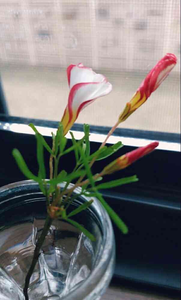 折れてしまったオキザリスの枝を水挿しにして…ガラス越しの光に開きかけています。