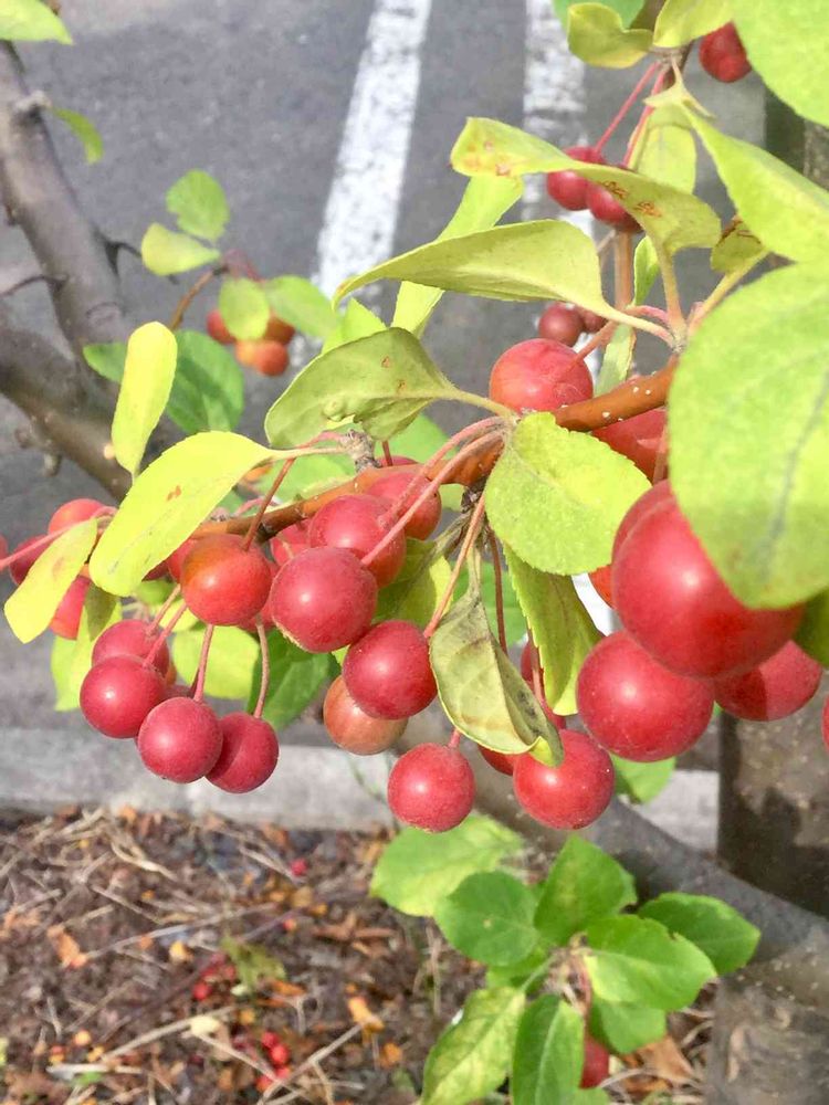 ニトリの垣根にたくさんコリンゴの木が植えてあって、ちょうど真っ赤な実が鈴なりになってます。さくらんぼよりだいぶ小さい実で可愛い😍