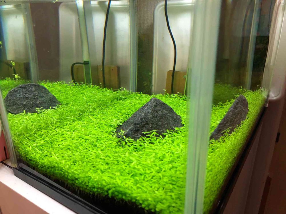 水槽の真ん中にストーンを配置した水草の絨毯。