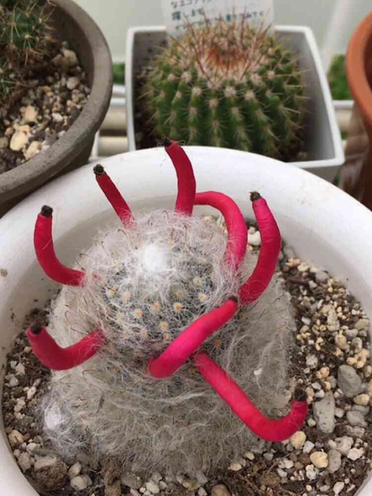 マミラリア属は唐辛子🌶のような実をつけるんだと思います。中にタネが入ってるんですよね?!