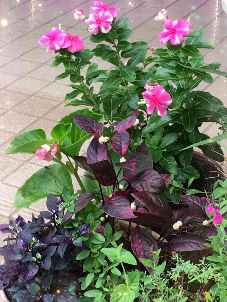今日のお花・ベゴニアの入った寄せ植えです✨。土に種が入っていたらしく空き鉢に芽を出してきてくれました😃❗️。それを活用して、赤葉のアルテルナンテラ“レッドフラッシュネオンカラー”と紫葉の鑑賞用トウガラシ“パープルフラッシュ”を寄せ植えしてみました。濃い葉色って良いですよね😊💕。