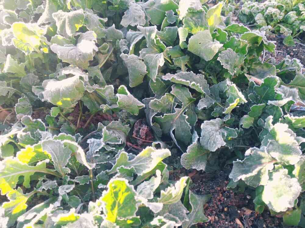 霜で真っ白なルッコラ。ほうれん草は霜で甘くなるけど、ルッコラはちょっとかわいそう。