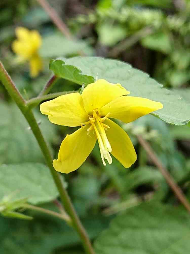 山地の道端や荒れ地に生えるアオイ科の1年草。お盆過ぎ頃から次々と下向きの黄色い花を咲かせる。果実は細長い形で、熟すと2つに割れて、中から種子がバラバラとこぼれ落ちる。