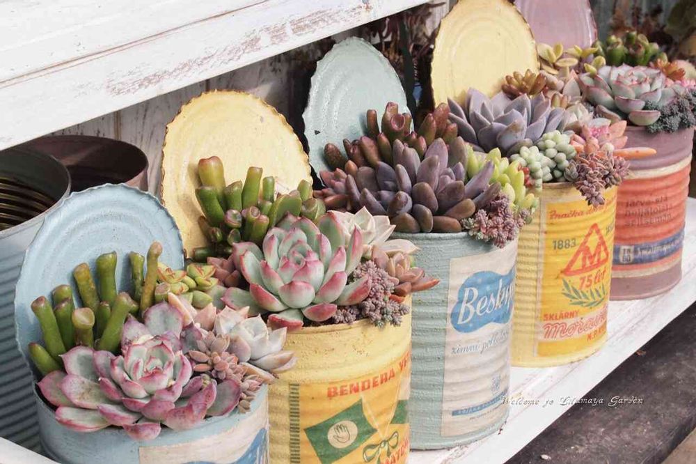太陽の光をたっぷり浴びるリメ缶寄せたち。