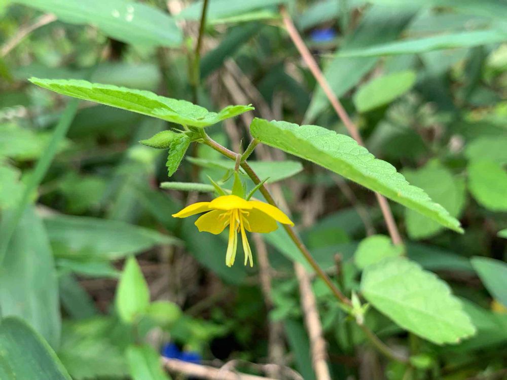 裏の山道でまたまた見かけぬ黄色い花を発見🎶葉っぱのかげに隠れるようにうつむいて咲いていました💕