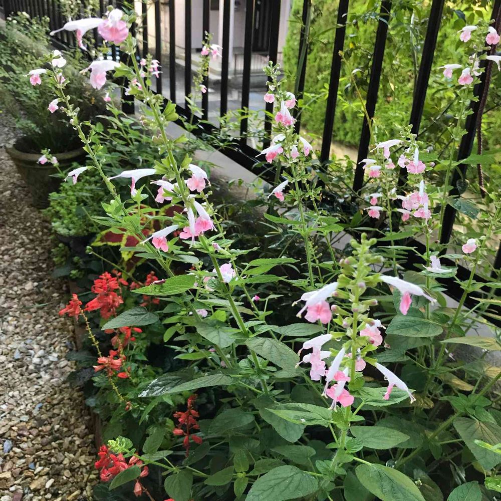 西側ガーデンの一画に只今ピンクのサルビア・コクシネアが勢いよく咲いています。