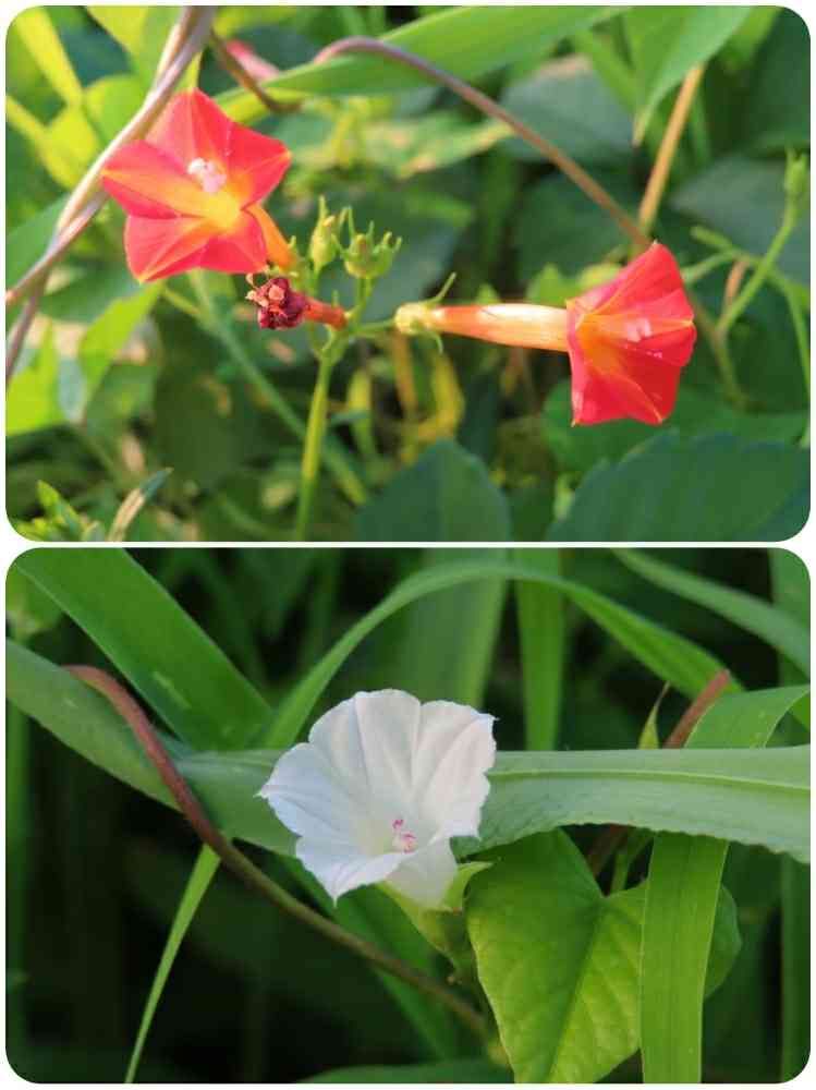 マルバルコウソウ(上): ヒルガオ科サツマイモ属、花冠はロート型、上から見ると五角形で直径15~18mm,花の色は朱赤色で中心部は黄色い。一日花で午後にはしぼむ。葉が丸く花がルコウソウ(縷紅草)に似ていることから、葉が丸いルコウソウという意味で名付けられた。北アメリカ原産で畑地、道端、荒地に生育する。