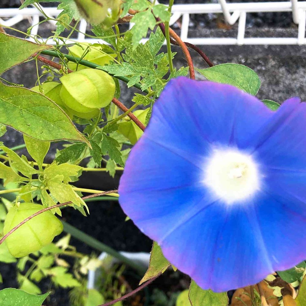 同じ鉢の中に、フウセンカズラも植えたから、両者絡み合って共存しております🤔