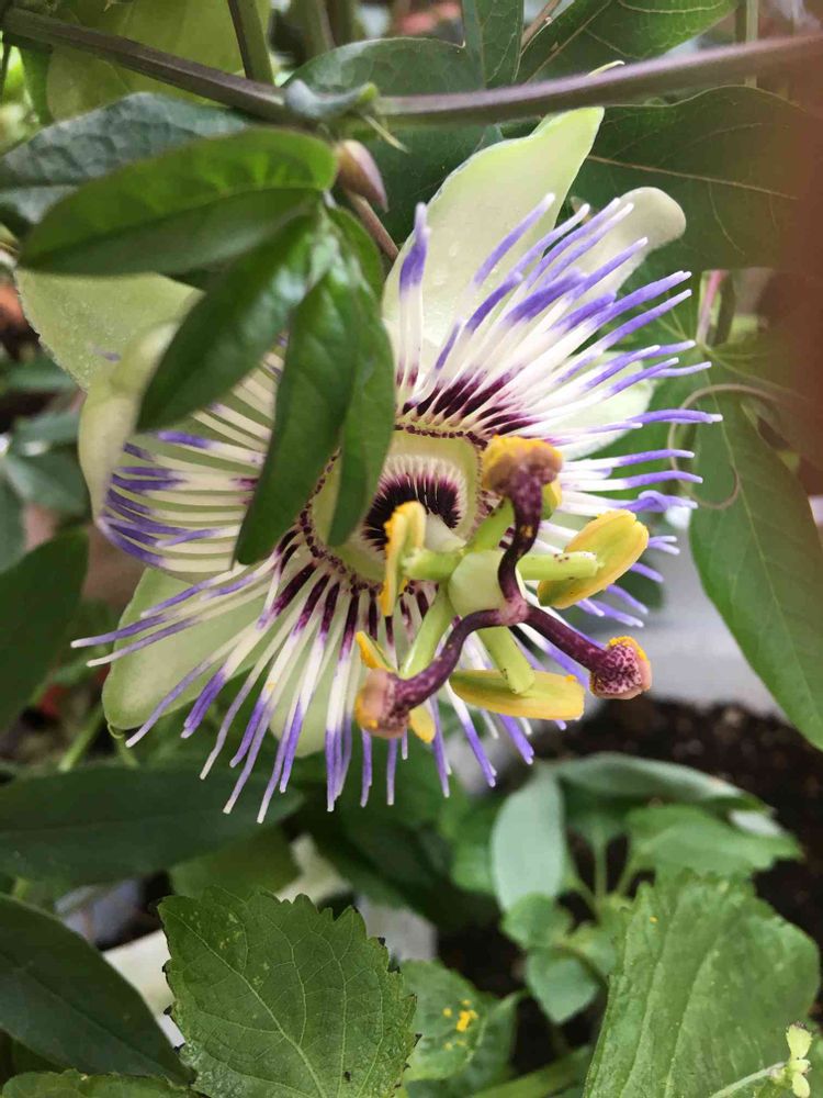 台風の影響で大半の植物達が倒れてしまったり、ポキリとなってしまった中、前回とは違う時計草が花を咲かせていました。何度見てもドキリとする特徴的なお花です👀💦