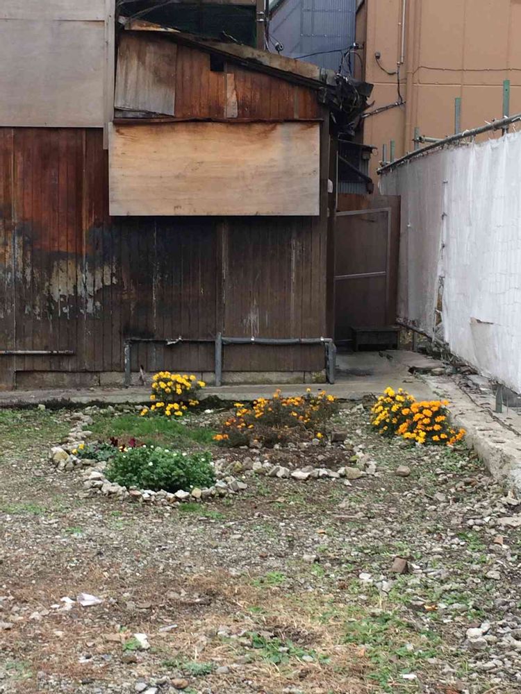 ラーメン屋さんが全焼してしまった跡の空き地にいつのまにか瓦礫の花壇ができてました。
