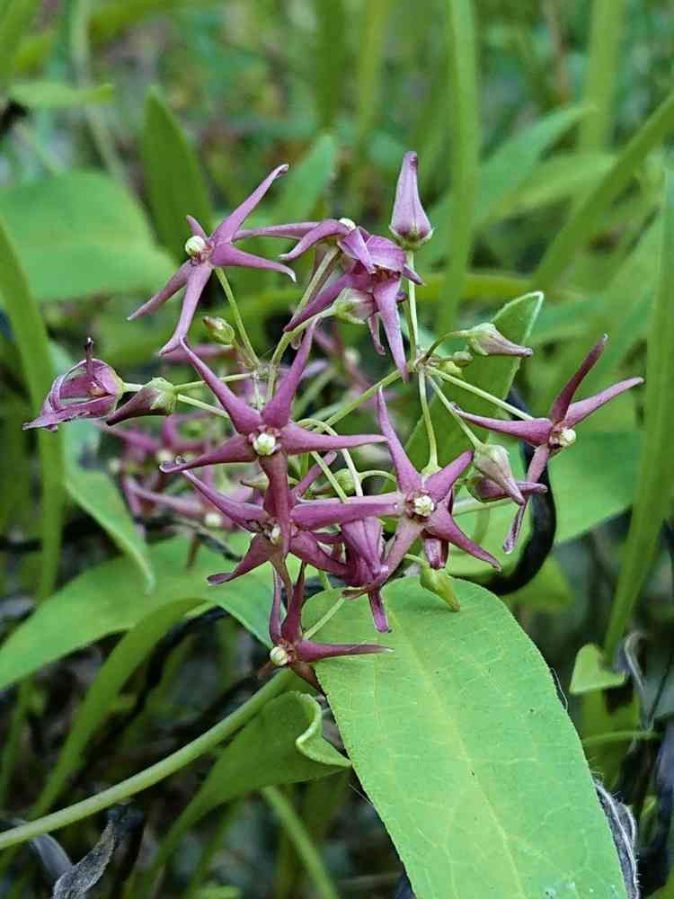 日当たりのよい湿地に生えるガガイモ科のつる性多年草。花は赤紫褐色で星のような形。