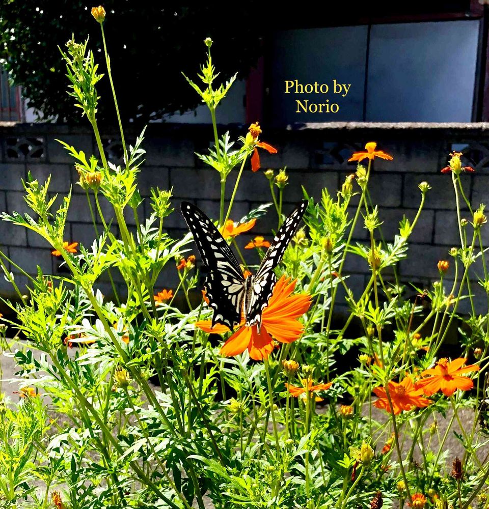 いつも通る道で咲いているキバナコスモスに、アゲハチョウが止まってました。