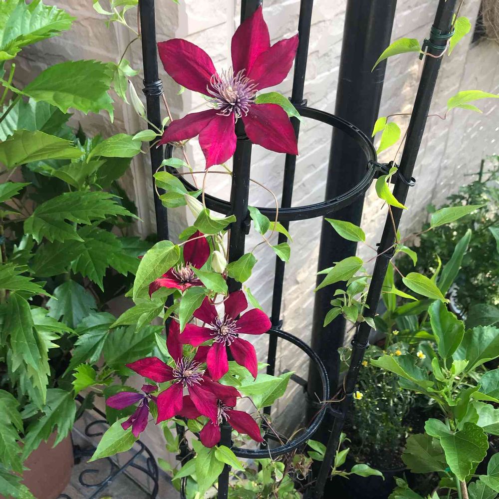 玄関先にそのみ飾れるとコンパクトなクレマチスです。玄関の門扉に置いていたら何回か花が咲いていたのですがいつの間にか門扉の上まで…。