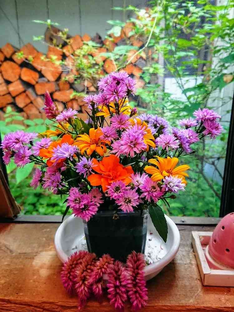 庭の花たちを✂️カットして 💐🌿ちょっとお雑に挿してみました(^。^;)🌿