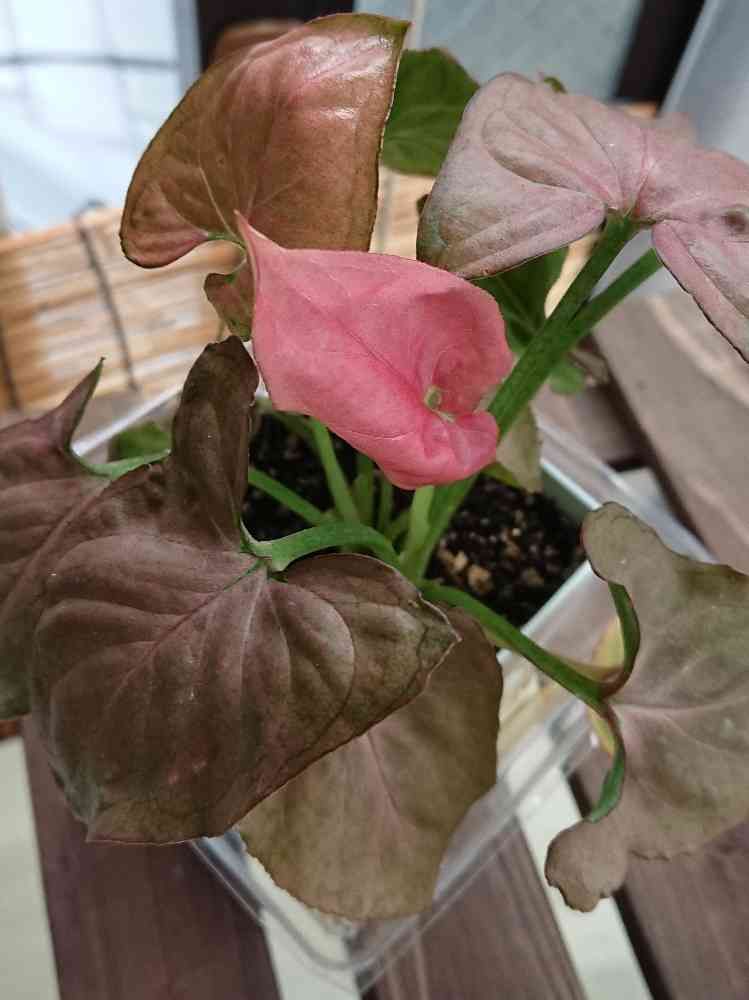チョコレート色に2枚目の新しい🌿はキレイなローズ🤔ピンク🙄そんな感じの初々しい色です😅
