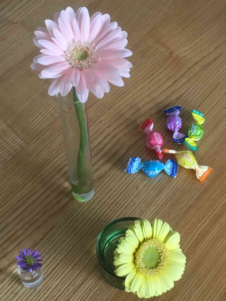 てできた〜内祝いの砂糖が入っていた容器にガーベラ入れてみました🌸
