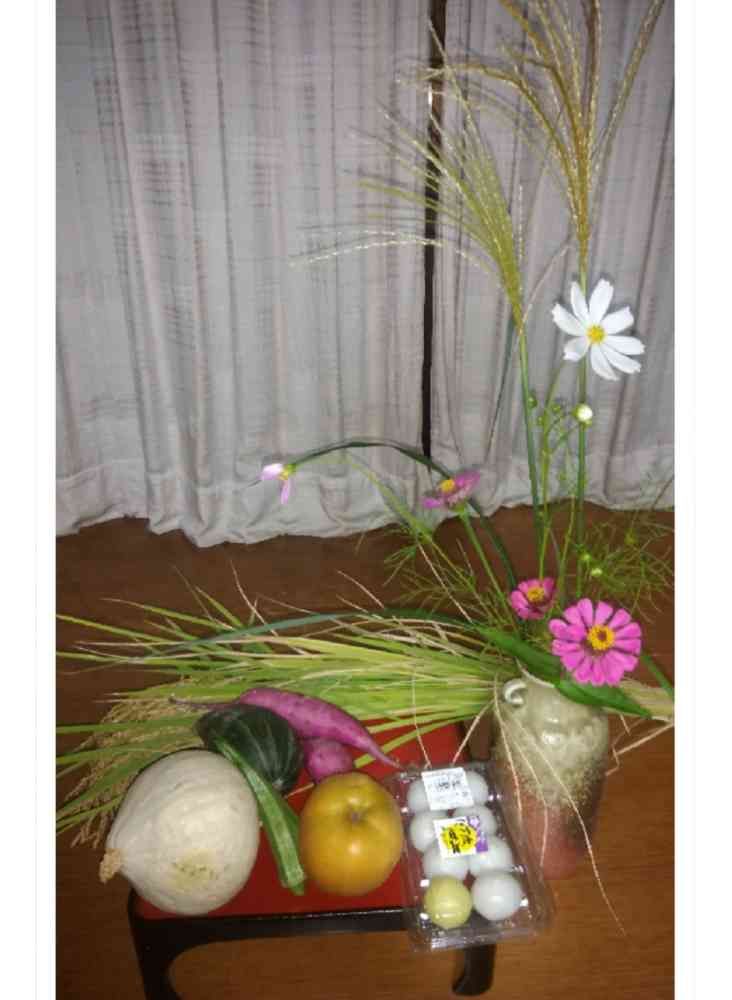 仕事帰りに十五夜🎑だと気付いたのでスーパーでダンゴとナシを買って、畑で獲れた🎃カボチャ、オクラ、🍠サツマイモと田んぼに寄って🌾稲穂とススキを調達して簡単にお供えして、収穫に感謝しました