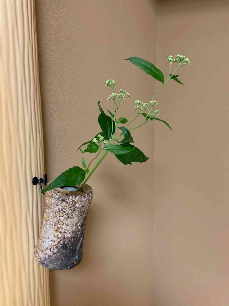 庭の藤袴を生けました。まだ蕾です。高さ2mくらいあるでしょうか。そんなに伸びるとは知りませんでした。先日の台風で折れてしまったところをハサミで切って、床の間に入れました。水が上がってよかった^ - ^