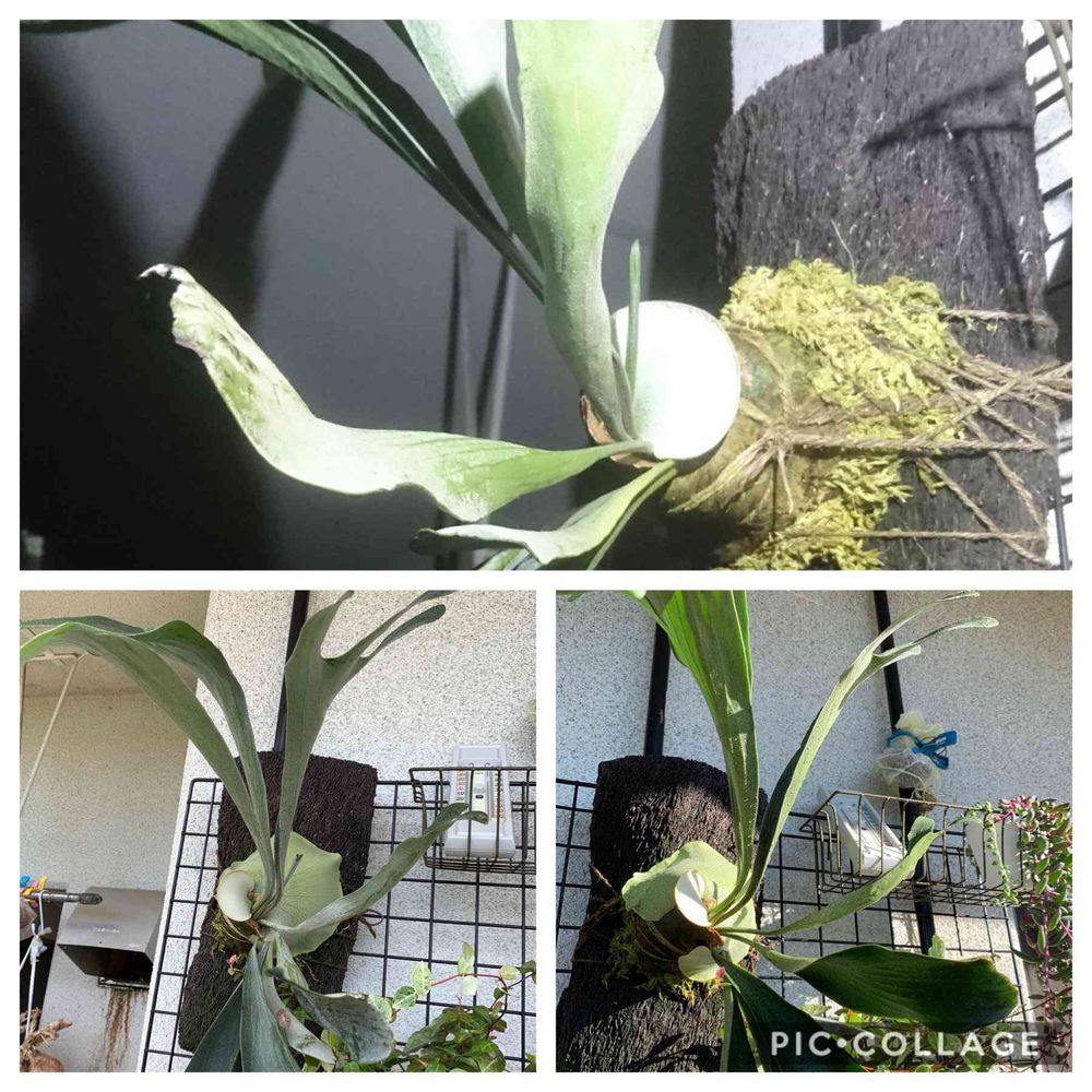 麻紐で板付したら、天地反対でやり直したり、水やりの度に水苔が落ちて紐が緩んで落ちたり、散々な目にあって来たビカクシダ。めげずに新しい貯水葉を展開してくれました。
