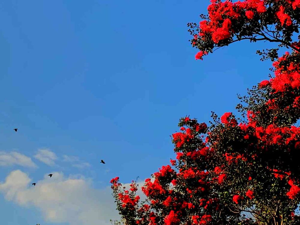 赤い波と鳥を浮かべた空