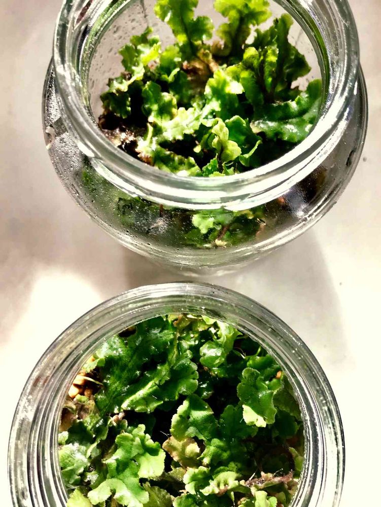 土は適当に鹿沼に木炭削った粉を混ぜて、瓶の底に軽石を敷き詰め、土を入れて、底にゼニゴケを置いただけ。