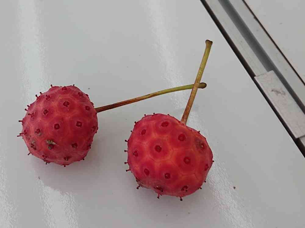 最初は偽物かと思って加減なくぷにぷに👈よく見るとこりゃあ本物だと判明 友達がこれは何の実?と不思議に思っていました😆でもなぜここにヤマボウシの実が!??