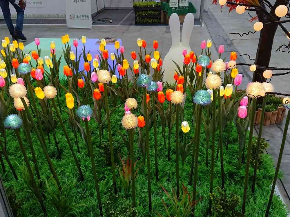 韓国の博物館の展示会の写真です このブースは造花のお花をライトアップしてるのかな?