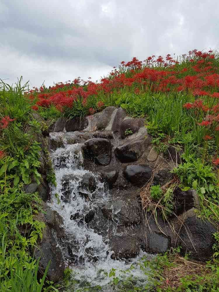 その中で、真っ赤な彼岸花がたくさん、静かに咲いて、風景を美しくしてぃますね。