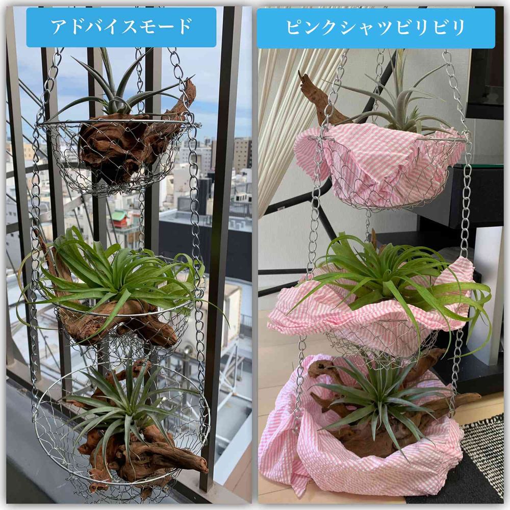 チランジアの設置について、みなさんアドバイスありがとうございました!現状うちにあるものを使い、チョコチョコ多肉さんのアドバイスを元にみなさんの意見を統合すると、画像左の形で設置するのがベストかなという結論に至りました🙇♂️