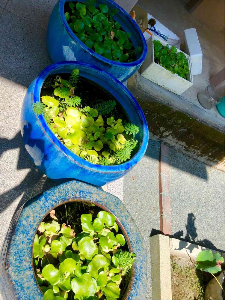 青色の水鉢にホテイアオイが映えてました。中にはメダカがびっくりするくらい沢山。