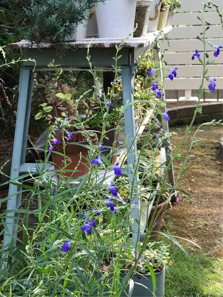 多肉棚の横に、青い花のコバルトセージが咲き始めました。💙