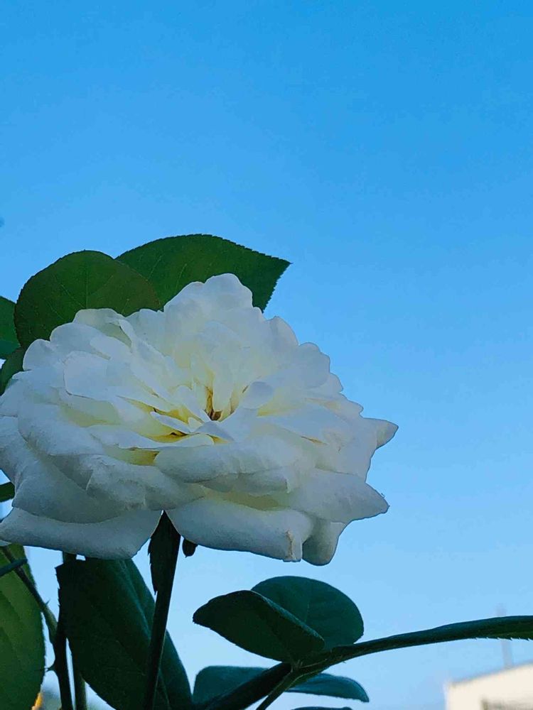 美しいです✨。綺麗な真っ青な空に真っ白な薔薇、とっても素敵ですね☺️