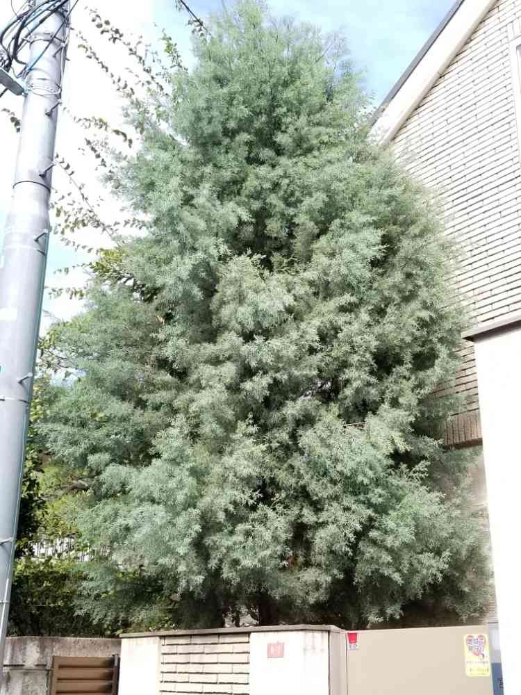 でっかくて堂々幅のコニファー、ローソン・ヒノキ『サマー・スノー』かなと思うんですが、確信ないです。