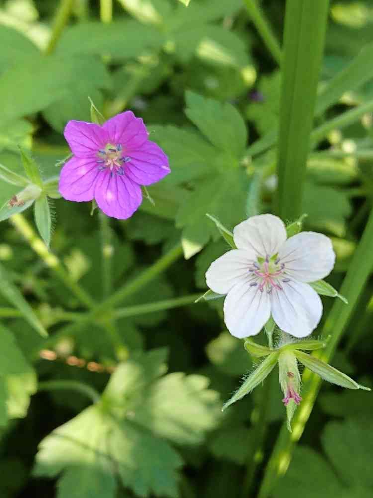 山野の日当たりの良い場所に生えるフウロソウ科の多年草。花色は紅白あり、赤花は西日本に、白花は東日本に多いというが真相は不明。