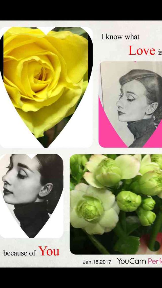 左下はオードリーヘップバーン、右上は、主人が通ってる整骨院の先生が描いたオードリーヘップバーン、右下は今日の薔薇咲きカランコエです❣️