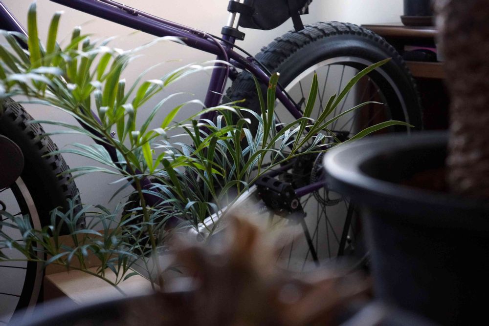 時は経ち、ハーレーの夢は泡のように消え、いつの間にか植物にまみれて生活しています。ハーレーを待ち切れず買ったバルーンタイヤの自転車はそんな夢の名残。