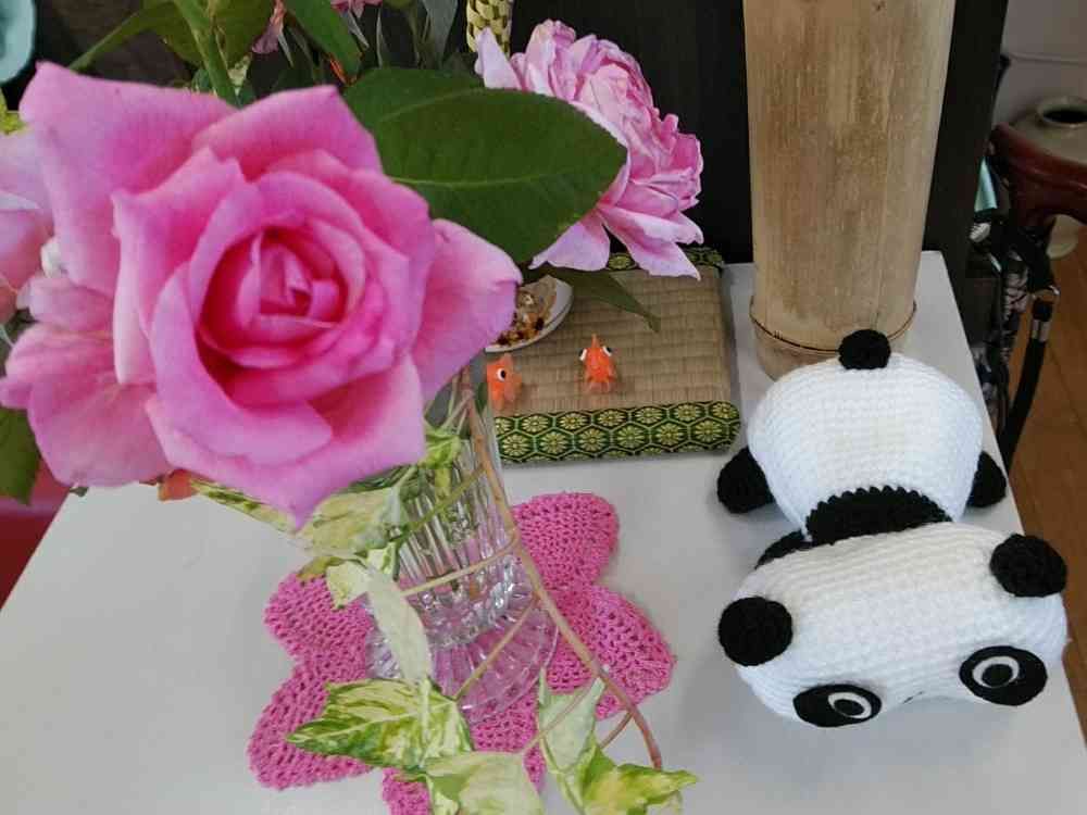 デイサービスにてバラとアイビーの横にパンダ🐼の編みぐるみ…誰の作品でしょう⁉️
