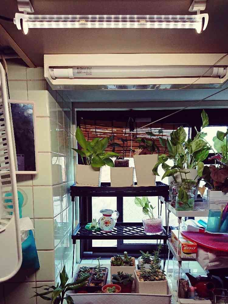 育成ライトを購入してみました🤩キッチンの袋戸棚に百均のフックをかまして、はさんでるだけです😅