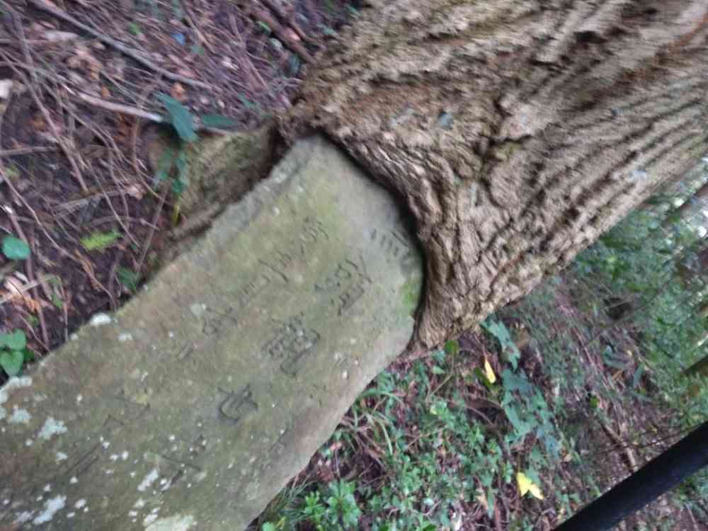 どういう経緯か、石碑が木にめり込んでいるのか、木が石碑を抱えて成長したのか?