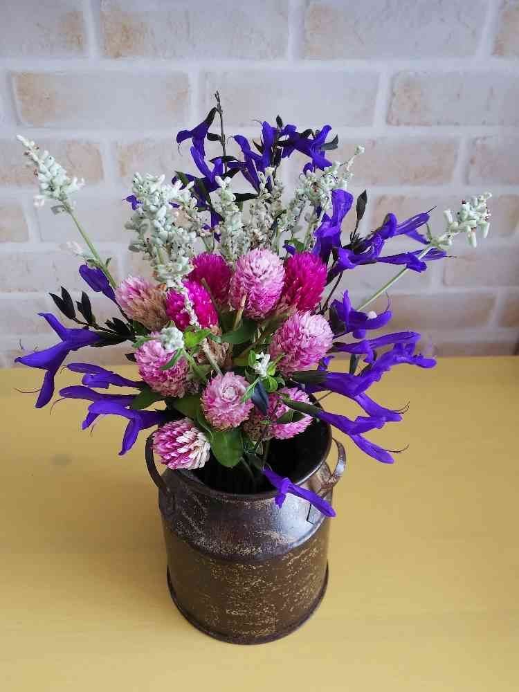 お外でドライ💐になっていた白いサルビアさんと千日紅をチョキン😃✂️✨して、メドーセージ💜と適当にまとめました😁