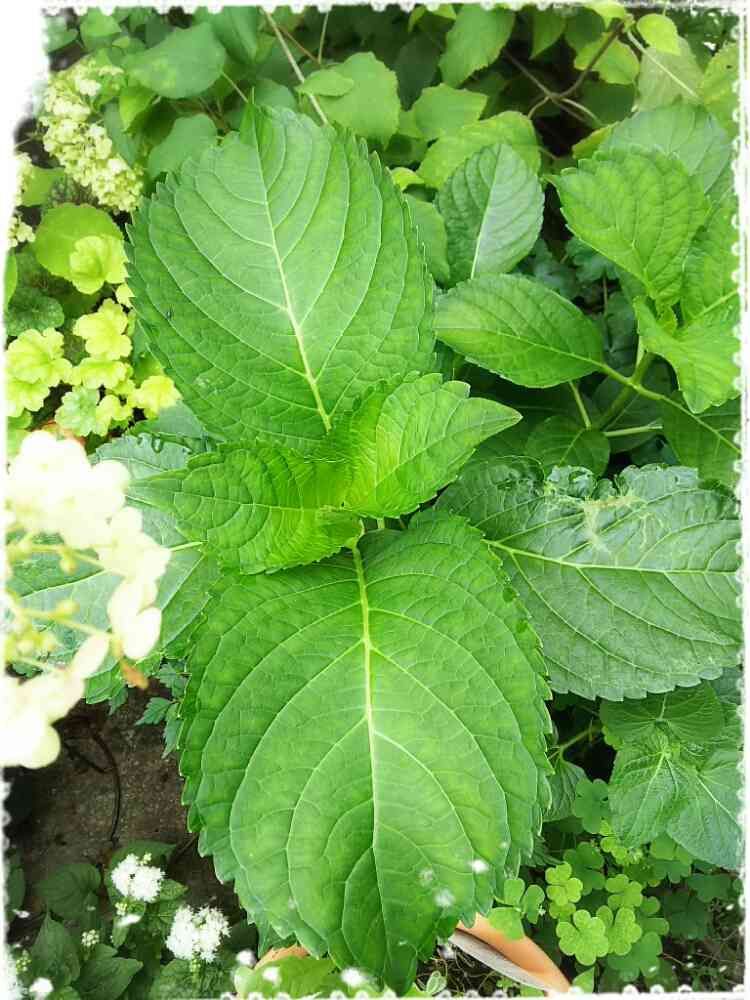 大型の花が付く秋色アジサイいっぽん買って 挿し木したら 大人の手の平サイズの葉っぱがつきましたよΣ(゚ロ゚;)✨