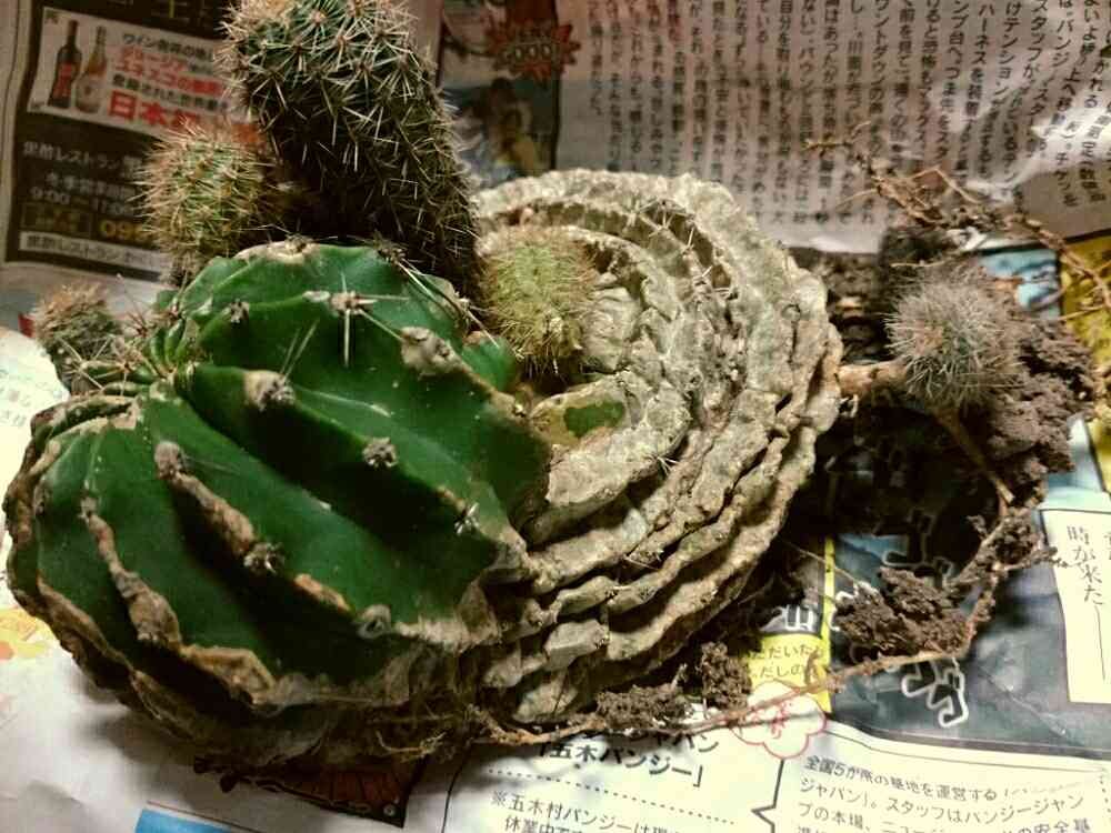 隣の鉢のサボテンを巻き込んで成長していました。一部は完全に合体しています(笑)うねって成長しているとこが、う○こ花火みたいです(≧∇≦*)