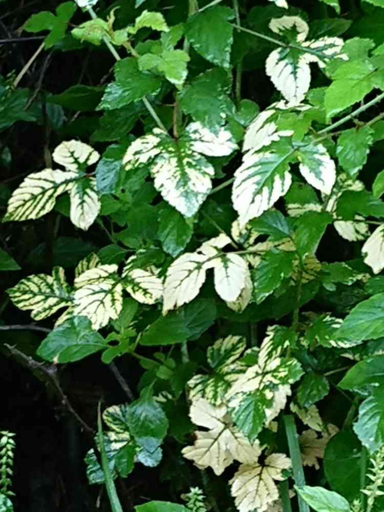 里山散歩で綺麗に斑の入ったニガイチゴの葉に出会いました。