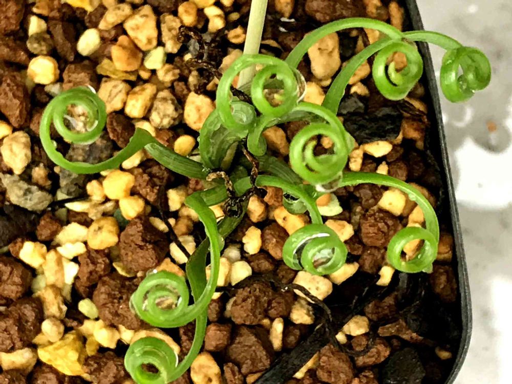 アルブカの葉が巻くのは、風対策だけでなくて水を捉えるためだったのかも、と思ったり。雫の綺麗な雨上がりの朝。